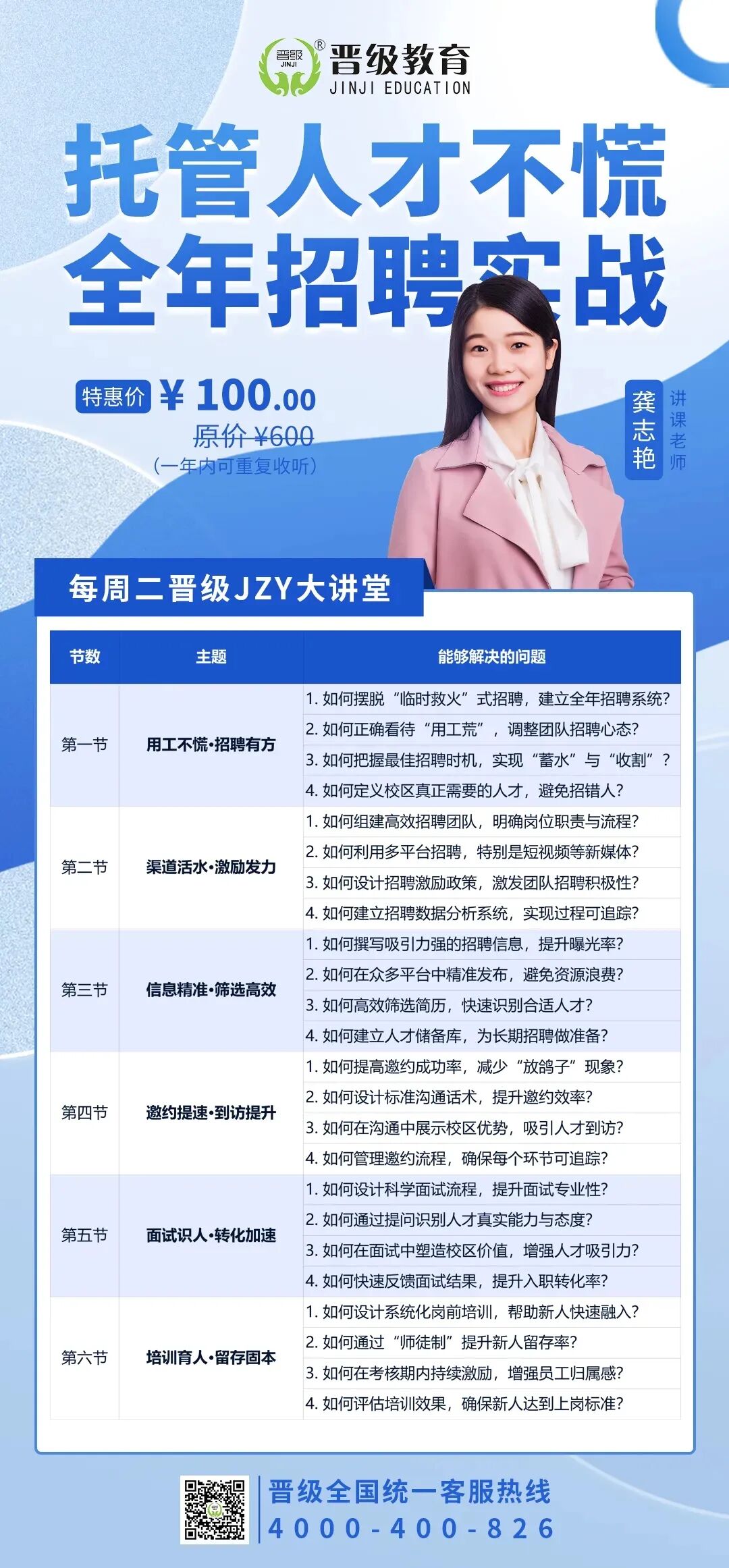 本周晋级JZY大讲堂,特邀晋级教育高级讲师龚志艳老师,带来核心课程《托管人才不慌,全年招聘实战》。本次课程共6节,旨在帮你建立起一套系统化、可落地的招聘解决方案,从源头破解招人、用人、留人的核心痛点,让你真正告别用工焦虑,打造一支稳定、高效的核心团队。